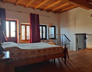 A l'étage vous trouverez l'espace couchage avec une grande chambre de 25m² et une autre chambre avec deux lits superposés, de 10m², et d'un coin repos canapé.