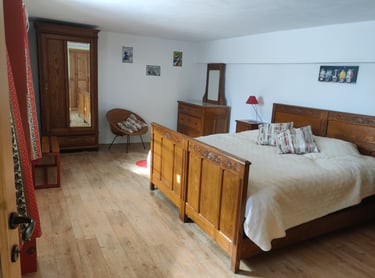Située à l'étage, beaucoup de charme dans cet écrin cosy qu'est la chambre "Rose Antique" de 15m² avec sa salle de bain. Pour une personne, vous aurez la vue sur la vallée. En choisissant cette chambre, vous aurez l'occasion de dormir dans un lit d'époque en fer forgé.