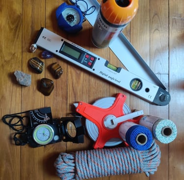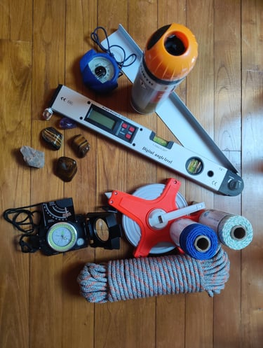 Boussoles, fils, laser, équerre, pierres, matériel de traçage.