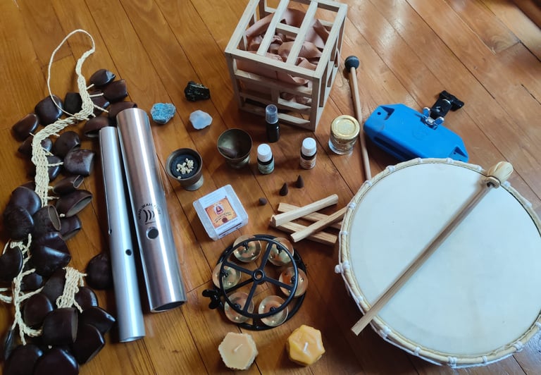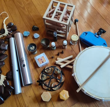 Pendant la prestation des instruments accordés à des fréquences justes, des encens appropriés ou encore des bougies sont là pour accompagner cette approche.